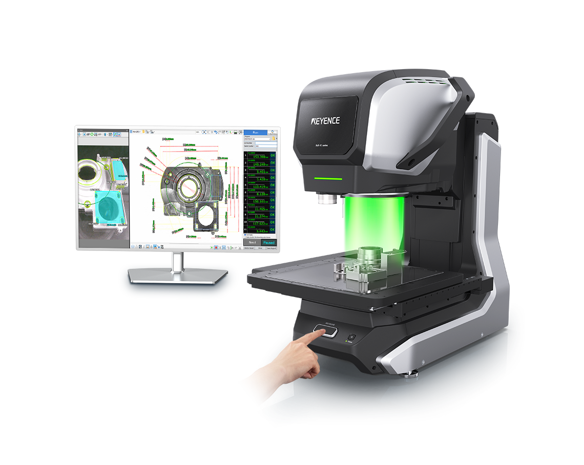 Produisant des images haute définition, le système de mesure dimensionnelle par imagerie Série IM-8000 offre une performance de détection triplée sans sacrifier la convivialité : placez la cible, appuyez sur le bouton et la mesure est lancée ! Un capteur CMOS de 20 mégapixels et un nouvel algorithme garantissent une détection stable des contours, mesurant avec précision jusqu’à 300 cotes en quelques secondes seulement. De plus, le tout nouveau mécanisme de rotation permet de maintenir à l’horizontale des cibles de toutes tailles et formes, pour mesurer plusieurs surfaces de la cible à 360° en une seule opération. Le fonctionnement est plus simple que jamais, il vous suffit d’appuyer sur le bouton MEASURE. Les résultats sont ainsi cohérents quel que soit l’utilisateur et la charge de travail sensiblement allégée. Rapidité, régularité et facilité sont les trois atouts de ce produit pour résoudre de nombreux problèmes de mesure.