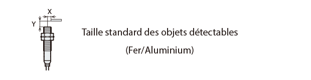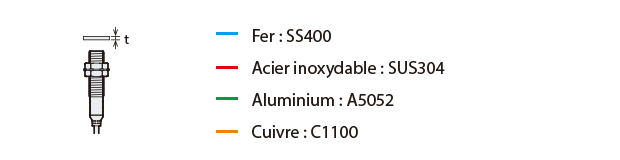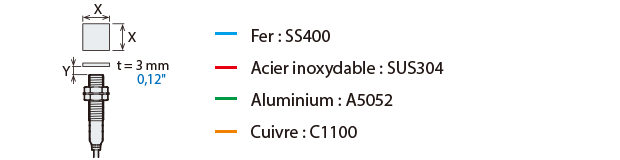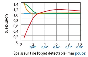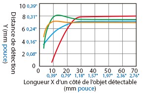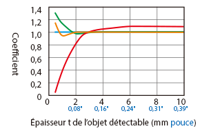 La distance de détection varie en fonction du matériau, de la taille, et de l’épaisseur de l’objet détectable. Il est possible de vérifier la distance de détection avec un objet détectable en multipliant la distance de détection Y (mm pouce) dans le diagramme des caractéristiques « Variation de distance de détection en fonction de la taille et du matériau de l’objet détectable » par le coefficient dans le diagramme des caractéristiques suivant.