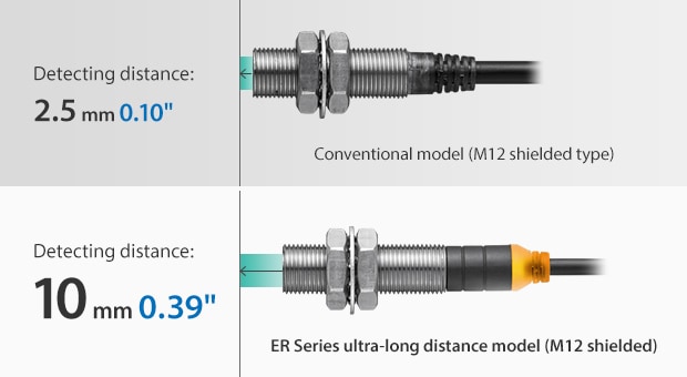 The ER Series enables ultra-long distance detection, allowing installation farther from the target, greatly reducing the risk of damage caused by impact and abrasion. It also prevents false detections caused by vibration or misalignment. The new Pulse oscillation + Dual-coil detection method enables flush metal mounting and long-distance detection without interference from surrounding metal.