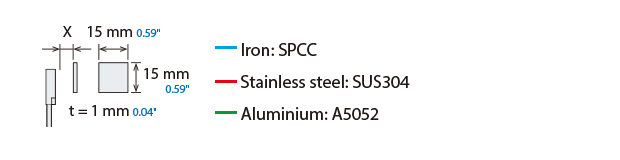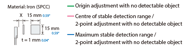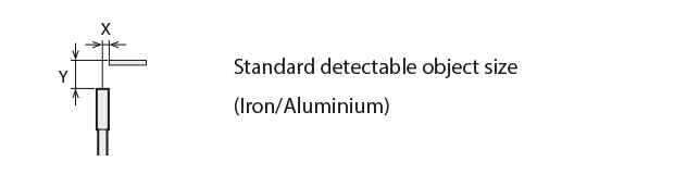 Detectable Object Size: 15 mm × 15 mm 0.59″ × 0.59″, Thickness t = 1 mm 0.04″ (Standard Detectable Object Size), Normal Mode
