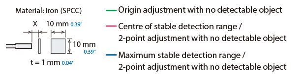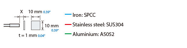Detectable Object Size: 10 mm × 10 mm 0.39″ × 0.39″, Thickness t = 1 mm 0.04″ (Standard Detectable Object Size), Normal Mode