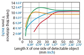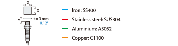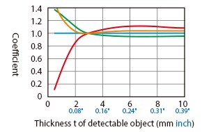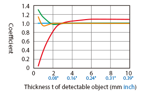 The detecting distance varies according to the detectable object material, size, and thickness. The detecting distance can be checked using a detectable object by multiplying the detecting distance Y (mm inch) in the “Variation of detecting distance according to the size and material of the detectable object” characteristic diagram by the coefficient in the following characteristic diagram.