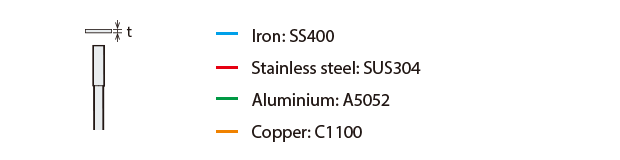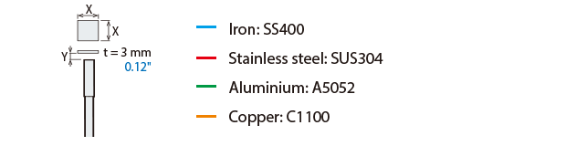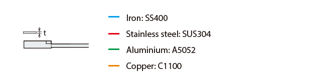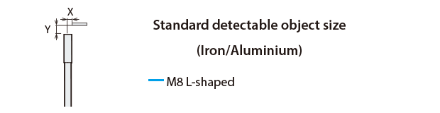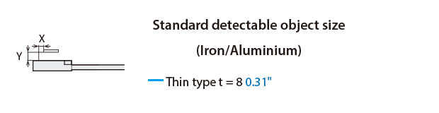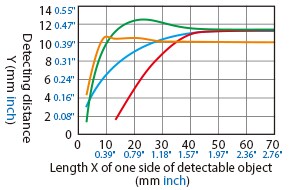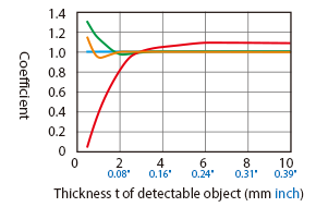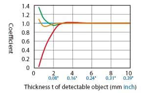 The detecting distance varies according to the detectable object material, size, and thickness. The detecting distance can be checked using a detectable object by multiplying the detecting distance Y (mm inch) in the “Variation of detecting distance according to the size and material of the detectable object” characteristic diagram by the coefficient in the following characteristic diagram.